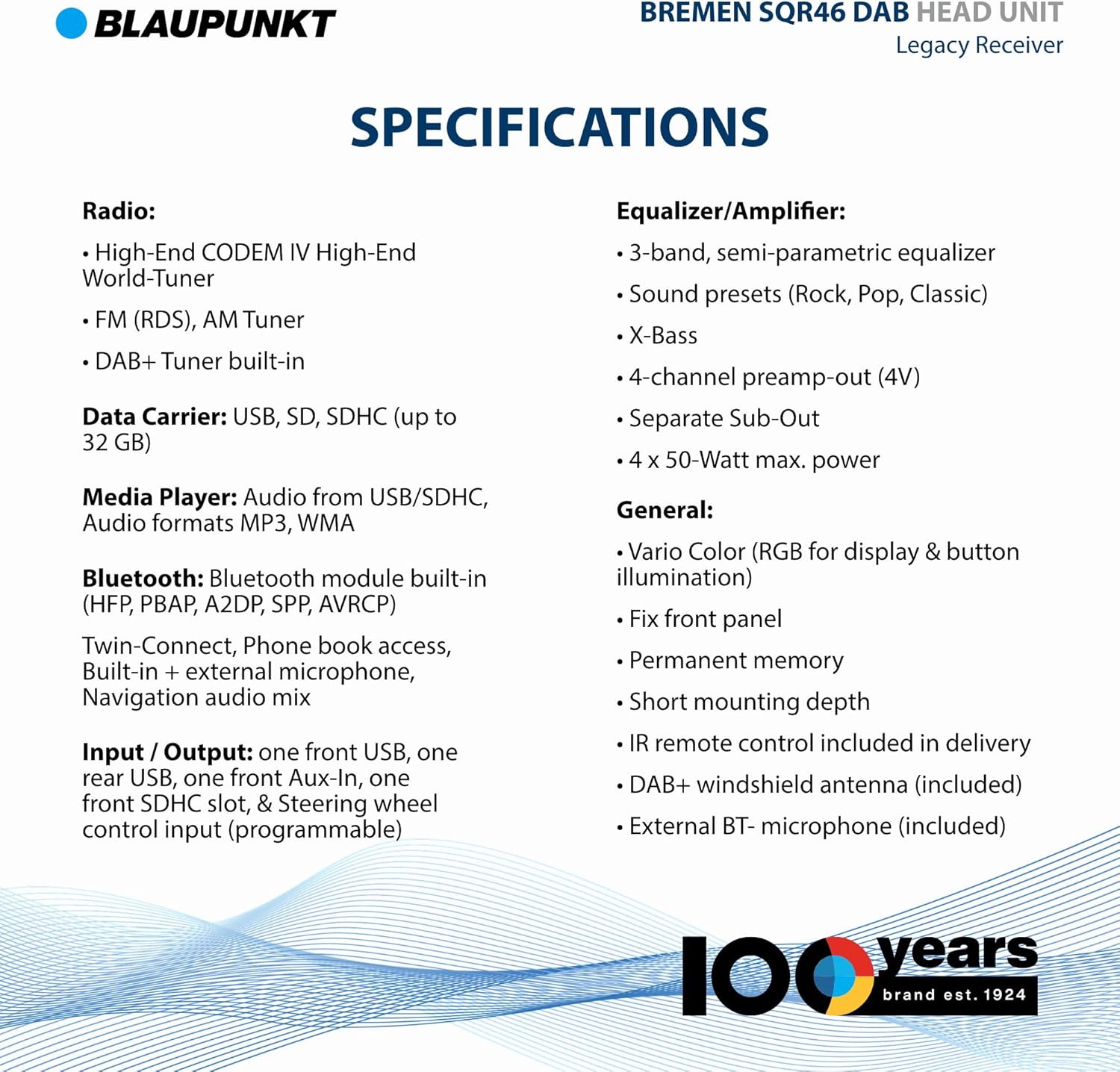 Blaupunkt Bremen SQR 46 DAB Retro Autoradio: Bluetooth, DAB+, USB, Aux-In, 4x50W, Kurze Einbautiefe