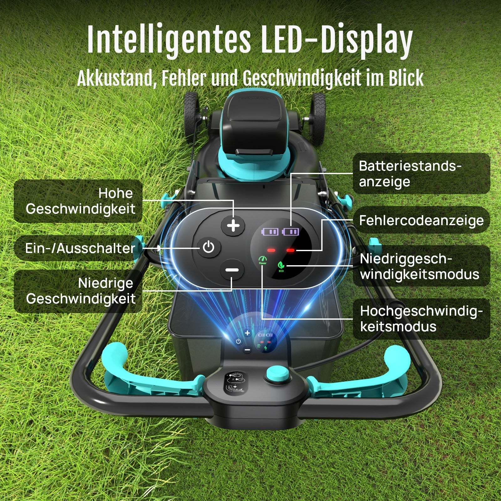 • 【Digitalanzeige】Der Akku Rasenmäher ist einfach zu bedienen und verfügt über eine Digitalanzeige, die Leistung, Fehlercodes und Geschwindigkeitsmodi anzeigen kann, sodass Sie den Status des Rasenmähers jederzeit kontrollieren können. – Einfach, präzise und benutzerfreundlich.